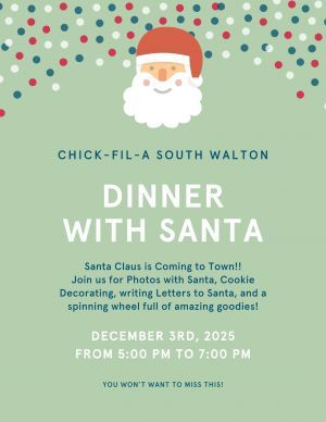Visit and photos with Santa, hot cocoa, facepainting, donations benefit unpaid Okaloosa County School Lunches.