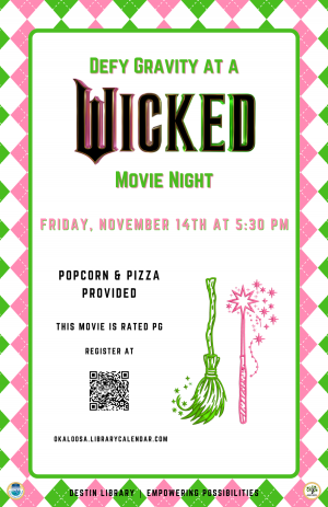 You are invited to the Destin Library for a special movie showing of Wicked (PG). Popcorn and pizza will be ...