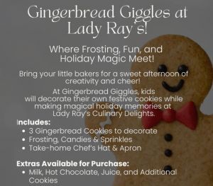 Gingerbread Giggles at Lady Ray’s! Where Frosting, Fun, and Holiday Magic Meet! Bring your little bakers for a sweet afternoon ...